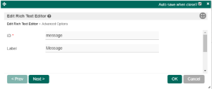 ID | Element ID (By declaring as "message", a corresponding database table column "c_message" will be created) Please see Form Element for more information about defining the ID and list of reserved IDs. | |