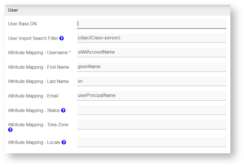 User Import Search Filter | (objectClass=person) Tips Value (&(objectClass=person)(|(cn=admin)(cn=cat)(cn=jack)(cn=john)(cn=jackie))) This mean all the LDAP entries which have "objectClass" attribute equals to "person" and "cn" attribute equals to either "admin", "cat", "jack", "john" or "jackie" are Joget users. So, when a login is performed by "admin", the search filter will add additional filter and become "(&(&(objectClass=person)(|(cn=admin)(cn=cat)(cn=jack)(cn=john)(cn=jackie)))(cn=admin))". You will notice an extra (cn=admin) is added to the search filter to make sure it return only the "admin" user. User License User license determines on how many eventual users (sorted alphabetically) from your LDAP/AD can log in into the system. You can make use of this attribute to control amount of users returned from your LDAP. Please refer to other LDAP Search Filter syntax. | |