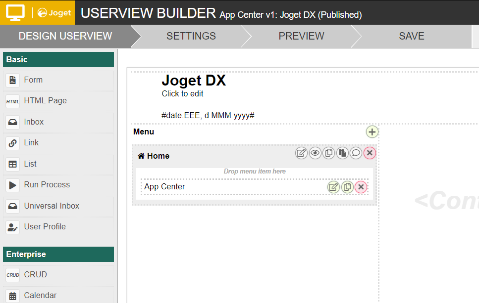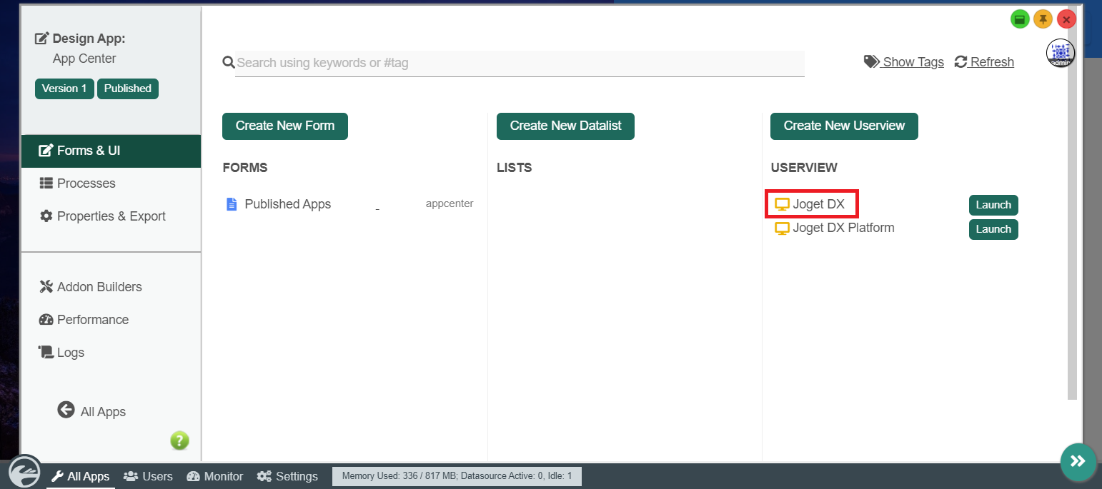 In the default installation, an app called "App Center" with the Userview named "Joget DX" is preloaded.