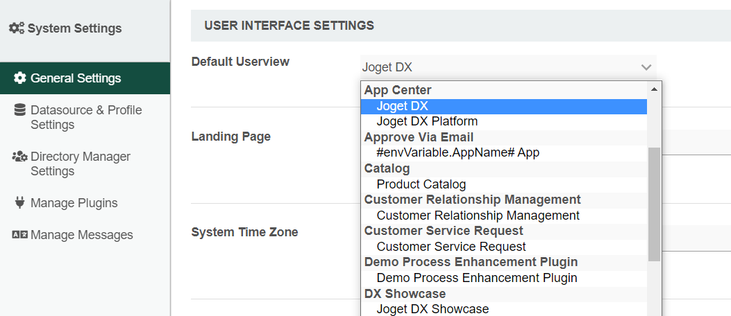 The default Userview here serves as the landing page when someone navigates to Joget.