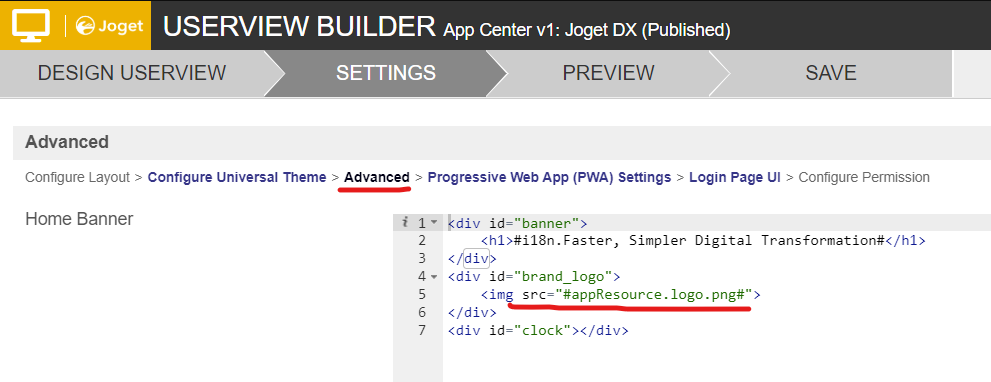 1. The logo that is displayed in the App Center can be changed under Settings > Theme > Advanced > Home Banner.