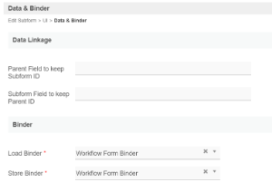 Load Binder | By default, the Workflow Form Binder plugin is used for loading and storage of form data in the subform, you may override it with other plugins. See the list of available Form Binder. | |