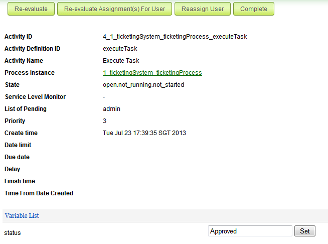 In this view, one can see the state and statistical data of a particular activity instance. One can also inspect and set workflow variable values for the activity instance.