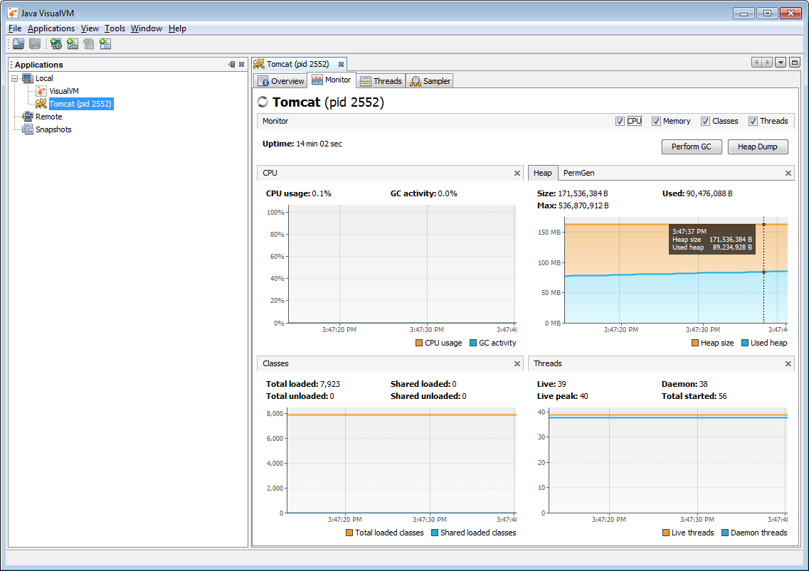 Monitor the health of your Joget system by using the VisualVM tool. VisualVM comes by default in JDK7 and newer.