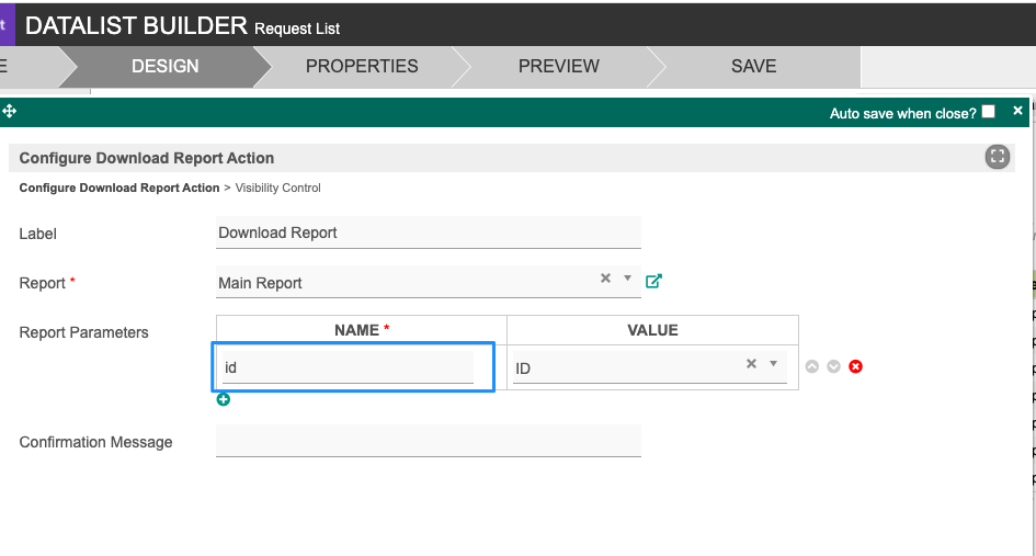 Record ID | Record ID to load form data from target form. Example For example, if the report is linked from a Datalist's Download Report plugin, we can retrieve the value set in its "Report Parameters" by using "reportParam" hash variable (i.e. #reportParam.id#) |