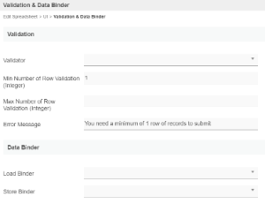 | Load & Save Binders | Load Binder allows you to customize the method for data retrieval to populate the multi-row spreadsheet in the form. Save Binder allows you to customize the method on how the spreadsheet row records are saved to. This option is empty by default. An empty binder means that the spreadsheet records will be saved/loaded as a JSON format in the parent form & database table. See the list of available Form Binders. The recommended binder to use is the Multirow Form Binder so that each record is saved into a child database table via a subform definition. The binder will update the foreign key "parent id" into each child record to point to the parent database table. | |
