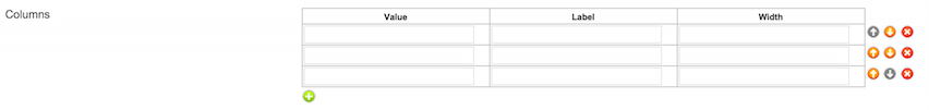 columns : [ {key : 'value', label : 'Value', required: 'true'}, {key : 'label', label : 'Label', required: 'true'}, {key : 'width', label : 'Width', options:[ {value : '10%', label : '10%'}, {value : '20%', label : '20%'}, {value : '30%', label : '20%'}, {value : '40%', label : '20%'} ]} ], value : [ {label : 'Username', value : 'username'}, {label : 'Status', value : 'status'}, {label : 'Message', value : 'message', width : '20%'}, {label : 'Date', value : 'dateCreated'} ]
