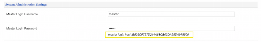 Assuming the master login username and master login password is "master" and "master" respectively, the master login hash will be "E505CF727D214A68CB03DA25DA978500".
