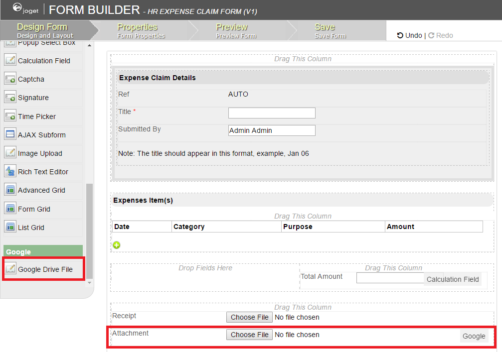 2. Once you have performed the step above, you are now ready to add Google Drive File Upload into your Joget form.