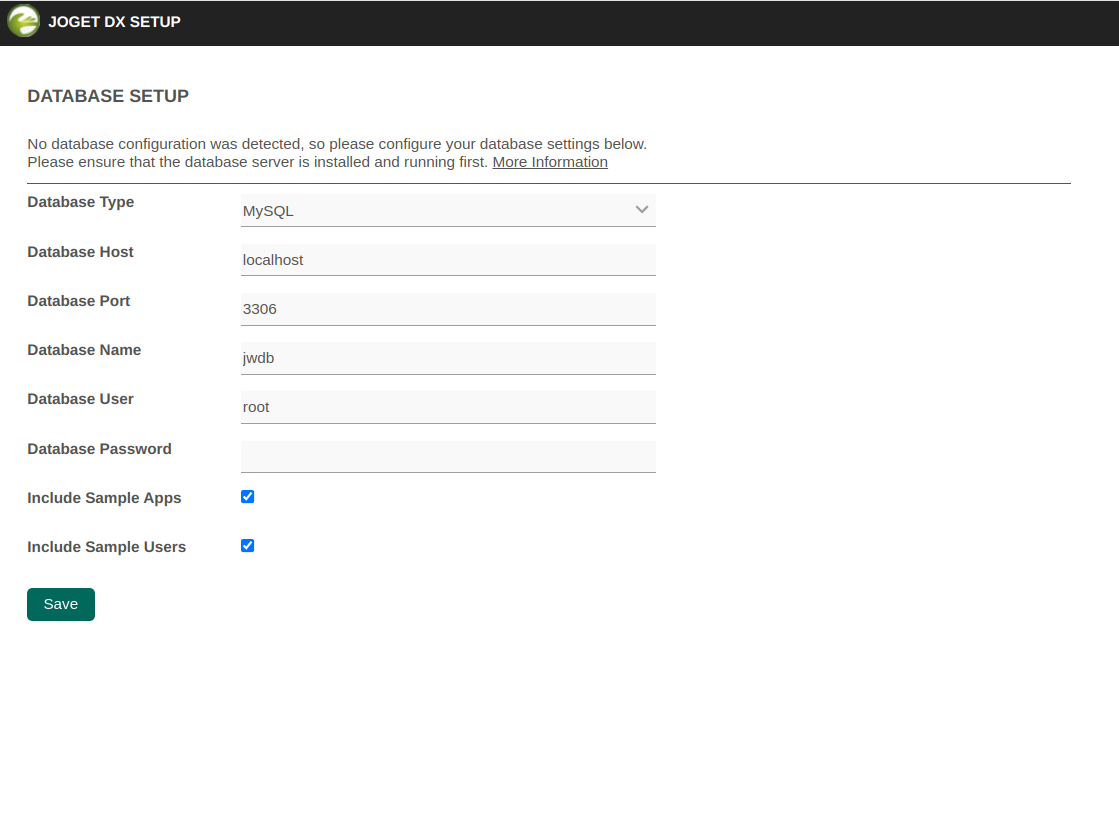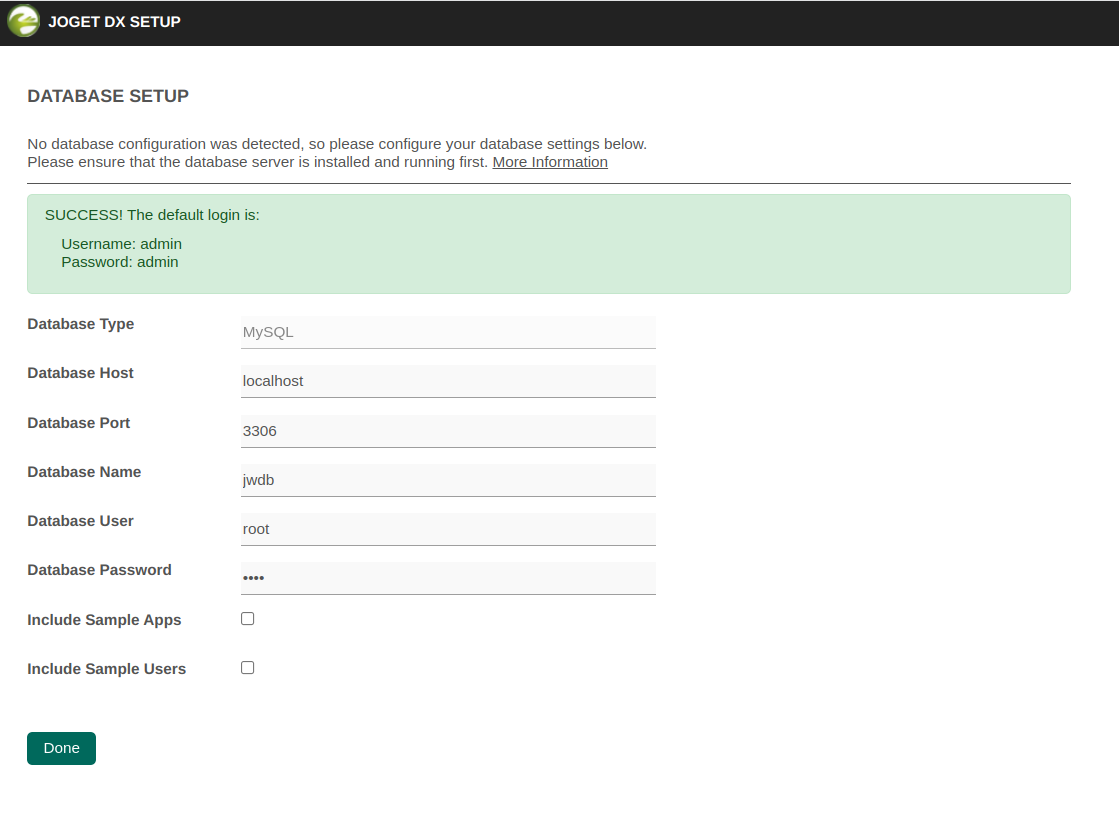 Include Sample Apps | Check to pre-load the sample Joget apps |