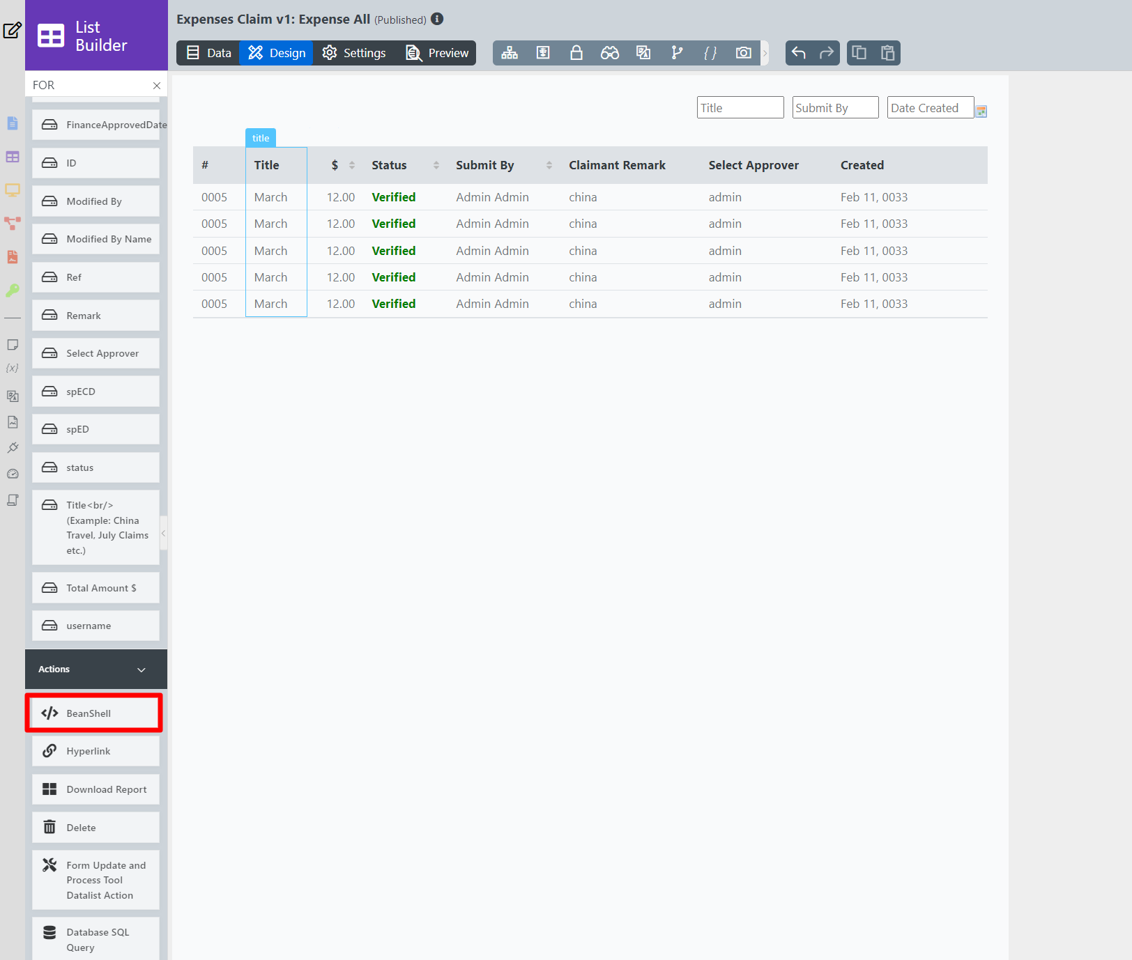 Configure BeanShell List Action