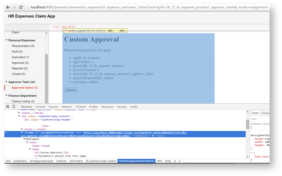 When an assignment is opened by the assignee from the Inbox, instead of viewing the usual Joget form, a iFrame will be shown pointing to the External Form defined in the activity mappings. A number of useful information about the assignment will be passed over as request parameter when the iFrame is loaded.