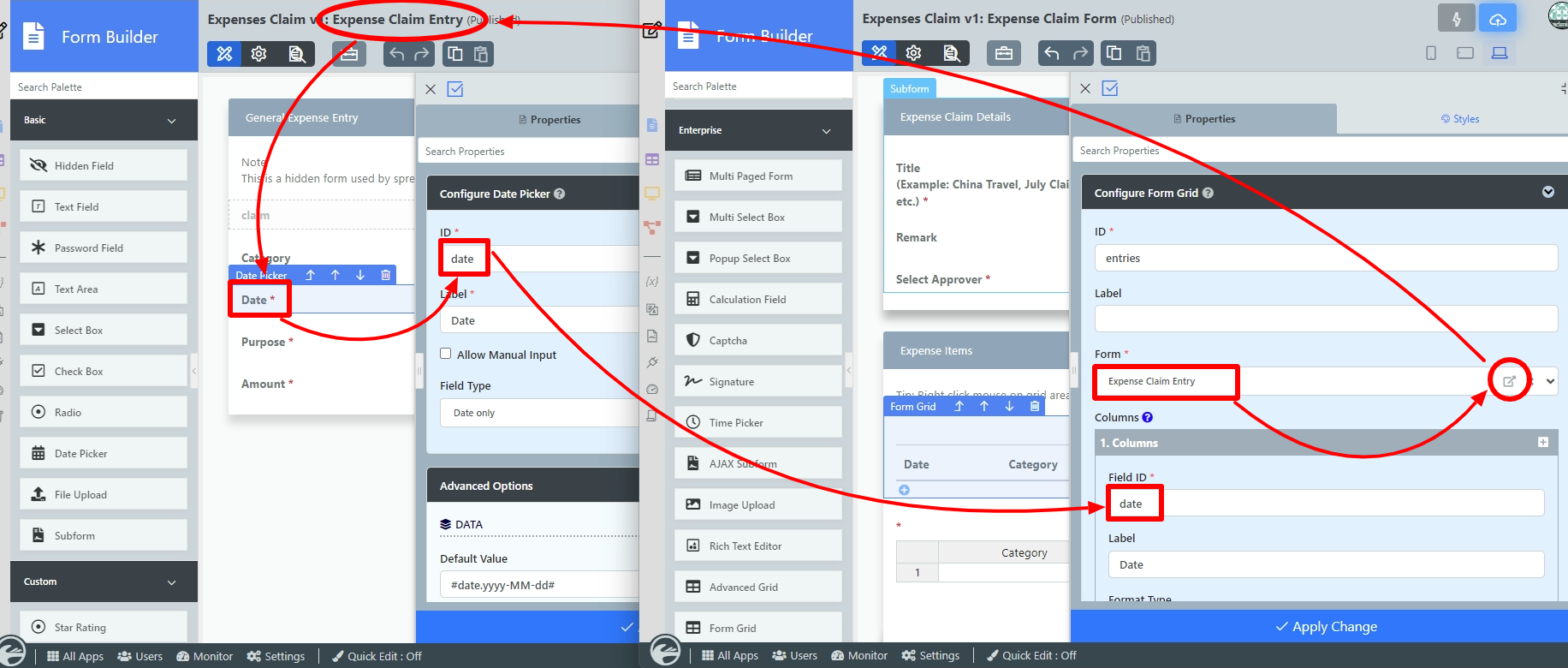Figure 4 - Open up Expense Claim Entry and note the Field ID's are the same as written in the Edit Form Grid. This is how the Form Grid displays the data from said target form. (see Figure 5)