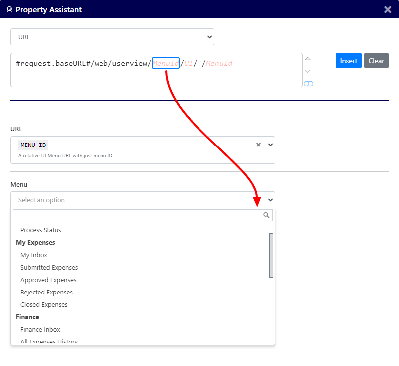 URLs in the property assistant refer to UI Menu URLs. This provides an easy way to access specific menus through the property assistant.