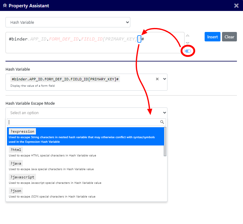 If you choose to show the optional chunks of Hash Variables or URLs, you can edit the App ID (Figure 3) and Escape Mode (Figure 5) (and even a Record's primary key depending on the hash variable used).