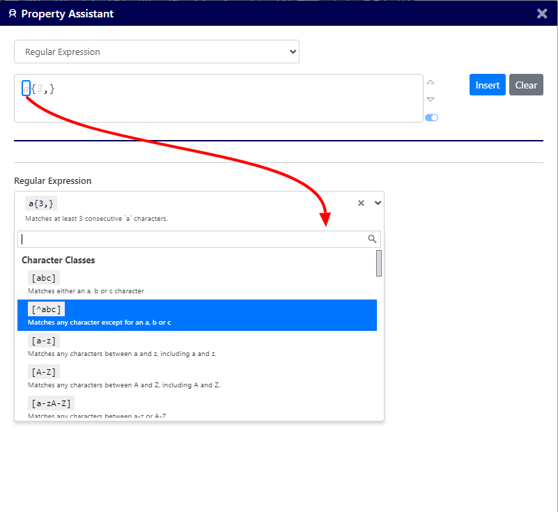[abc] | Matches an a,b or c character. Note that the characters a,b or c can be replaced with any other character with the help of the property assistant. |
