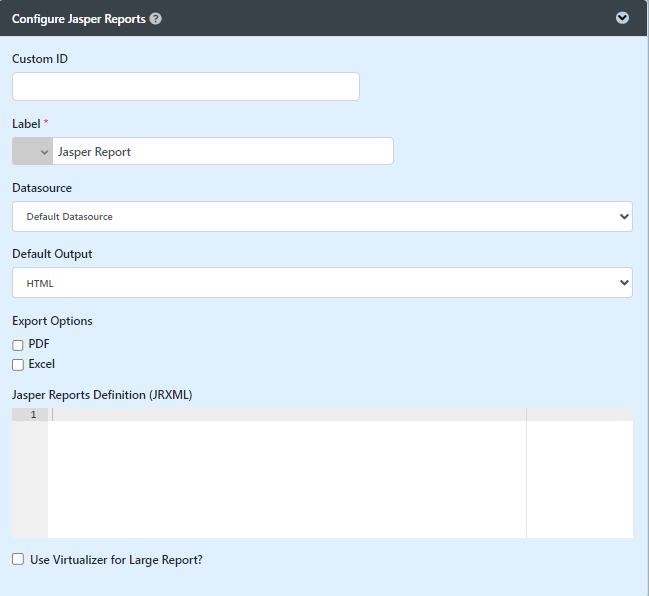 Jasper Report Definition (JRXML) | Paste your JRXML definition in XML here. |