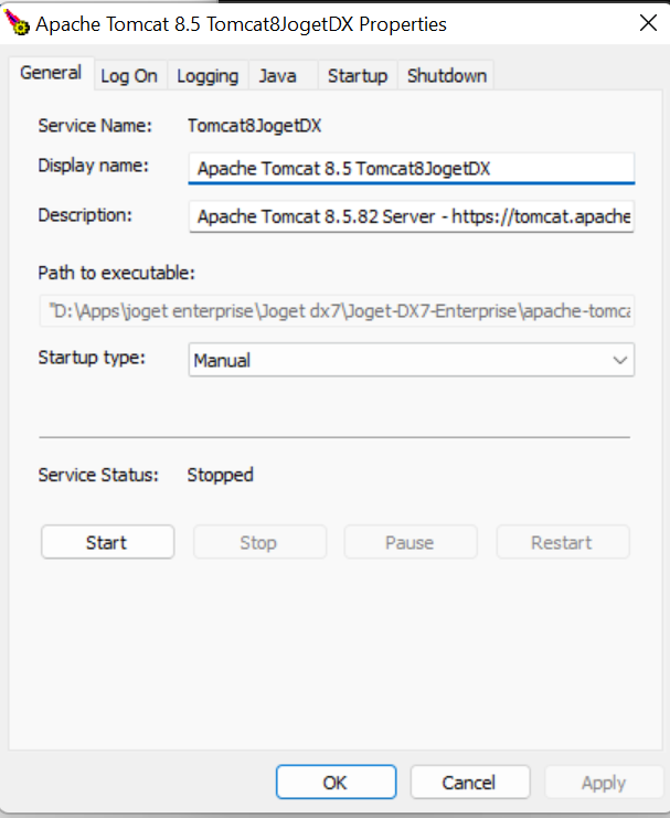 กลับไปที่โฟลเดอร์ \ apache-tomcat-8.5.54 \ bin เปิดขึ้น tomcat8w.exe //ES/Tomcat8JogetDX