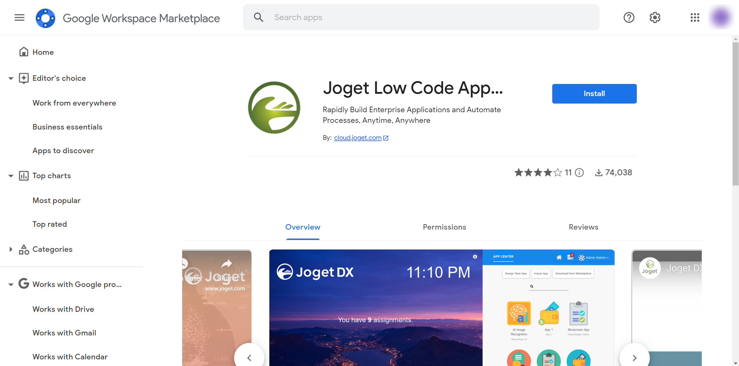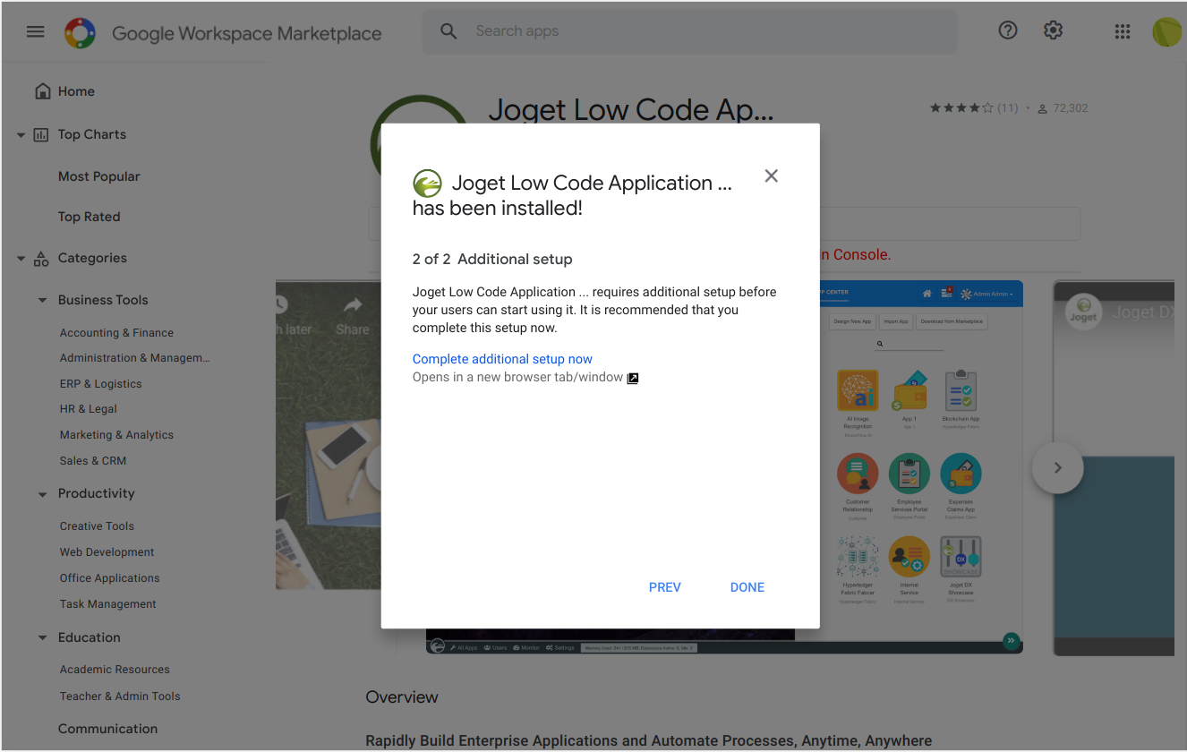 To install Joget for your Google Workspace domain with single sign-on (SSO), just follow the steps below:Visit the Joget Low Code Application Platform page in the Google Workspace Marketplace.