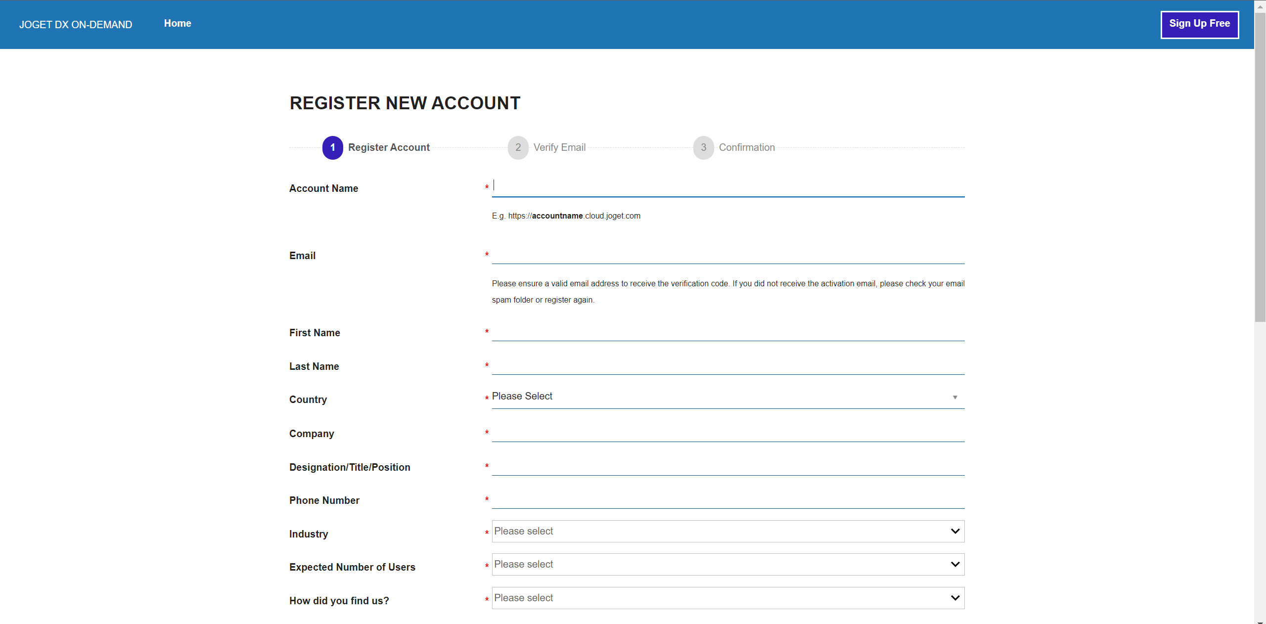 In the Joget registration page, fill in your contact details and click on Submit. This will immediately create the Joget account for your Google Workspace domain.