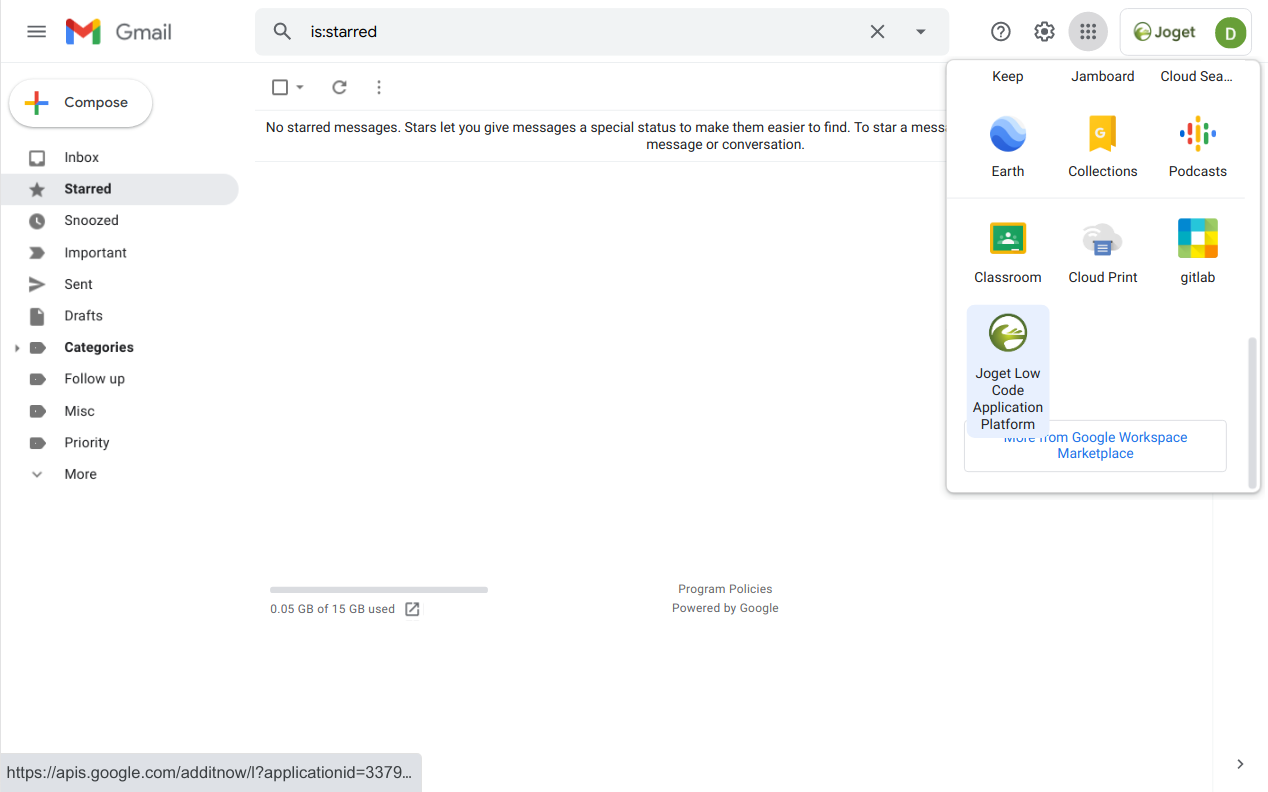 The Joget Low Code Application Platform icon will also appear in the Apps launcher at the top right of the Google Workspace header for all your domain users.