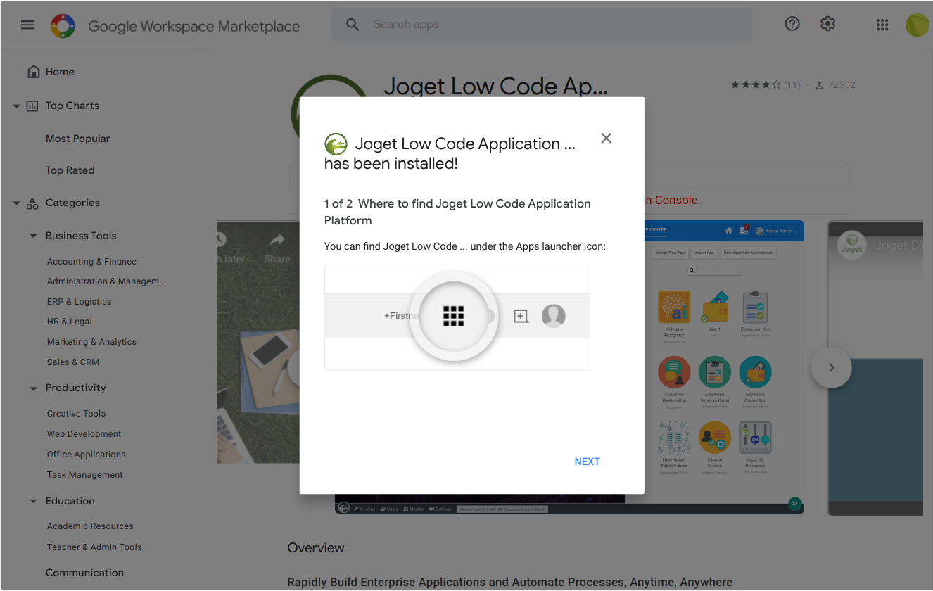 At this point, Joget has been installed in your Google Workspace domain. Click on NEXT.