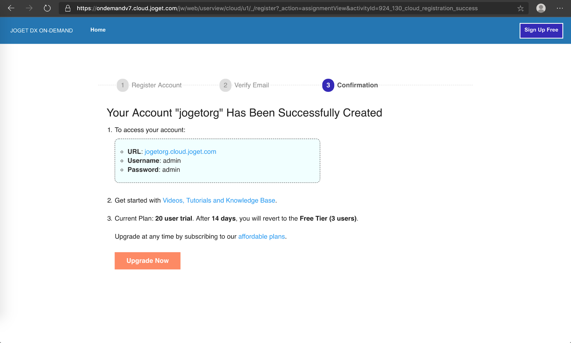 Once the creation is completed, you will get a confirmation screen with the account information. Click on the URL to access the Joget installation.