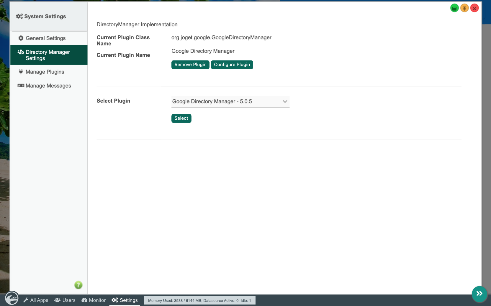 Login to Joget as an administrator. Go to Settings > Directory Manager, and click on Configure Plugin for the Google Directory Manager.