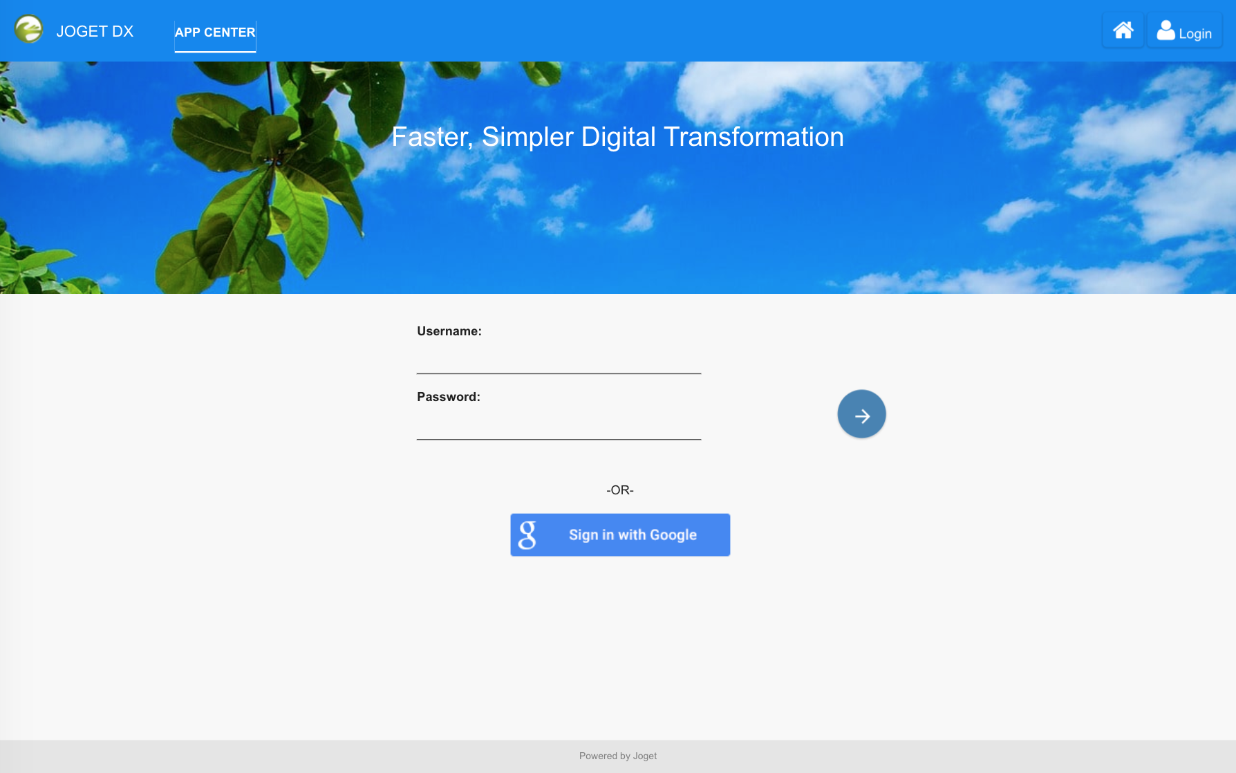 You can login to the Joget installation using the Sign in with Google button, or using the default admin user account credentials.