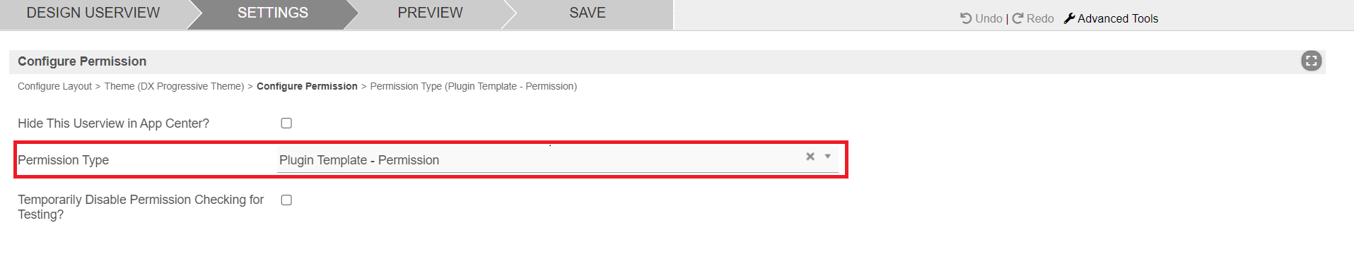 The Permission tab in the Advanced Tool ( Advanced Tools > Permission ) of the Userview Builder can utilize the Permission Plugin template created to provide the app designer with fine-grain control over managing the permissions of each individual element in the builder.