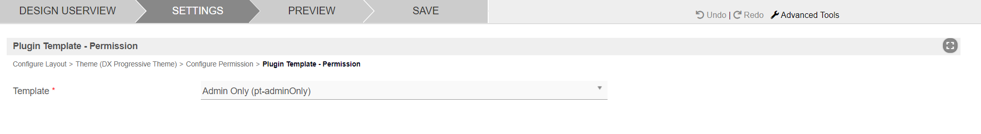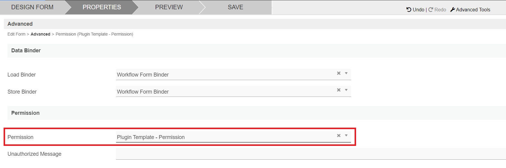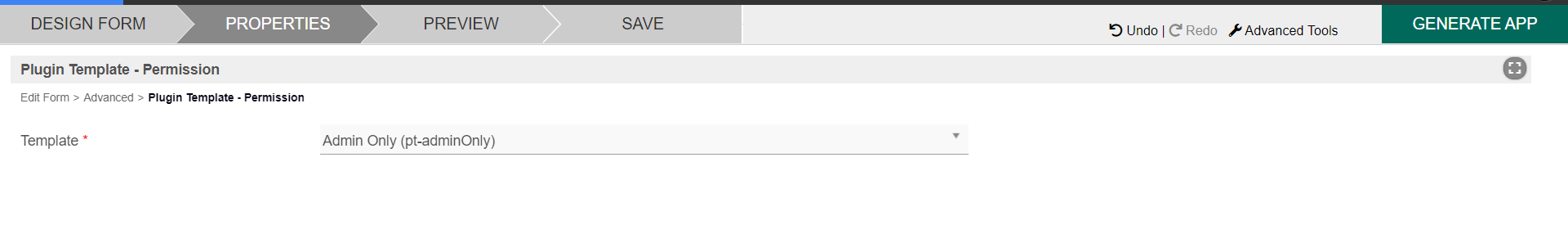 The Permission tab in the Advanced Tool ( Advanced Tools > Permission ) of the Form Builder can utilize the Permission Plugin template created to provide the app designer with fine-grain control over managing the permissions of each individual element in the builder.