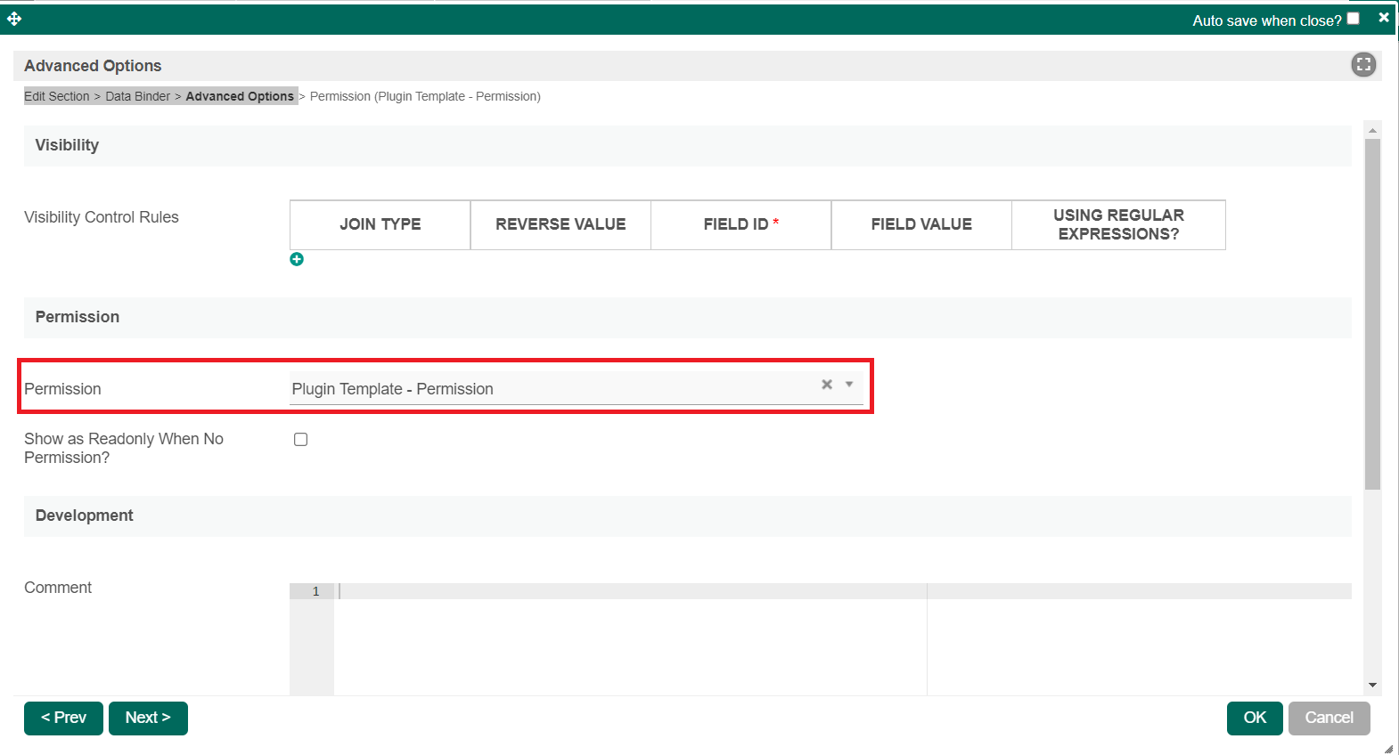 4. For applying the Permission plugin template at the Form Section level, go to the Form Builder, select the Edit Section icon of the section, navigate to Edit Section > Data Binder > Advanced Options and choose Plugin Template - Permission for the Permission Type field. (See Figure 9)