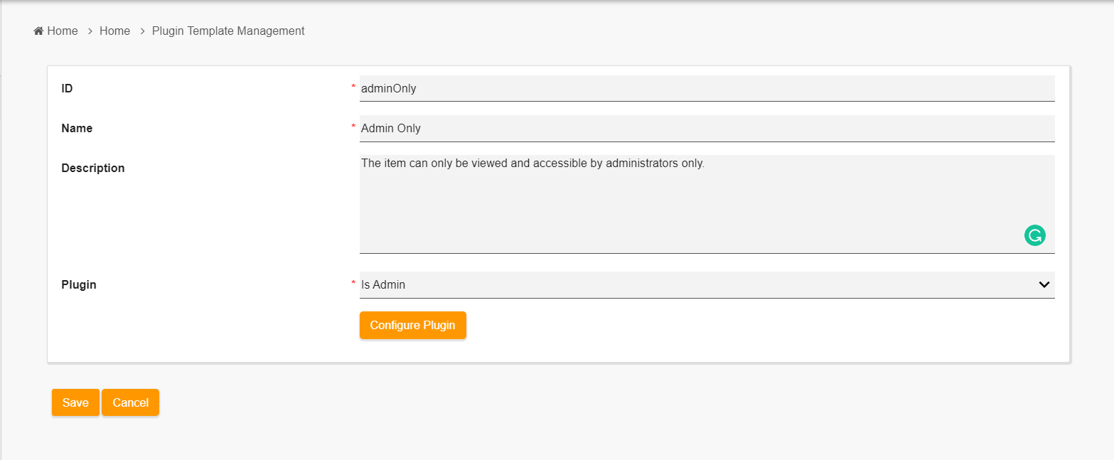 2. Fill up the Plugin Template Management Page accordingly and for the "Plugin" field choose any one of the formatter under Userview Permission or Form Permission . The is Admin is chosen for the Plugin field. (See Figure 2)