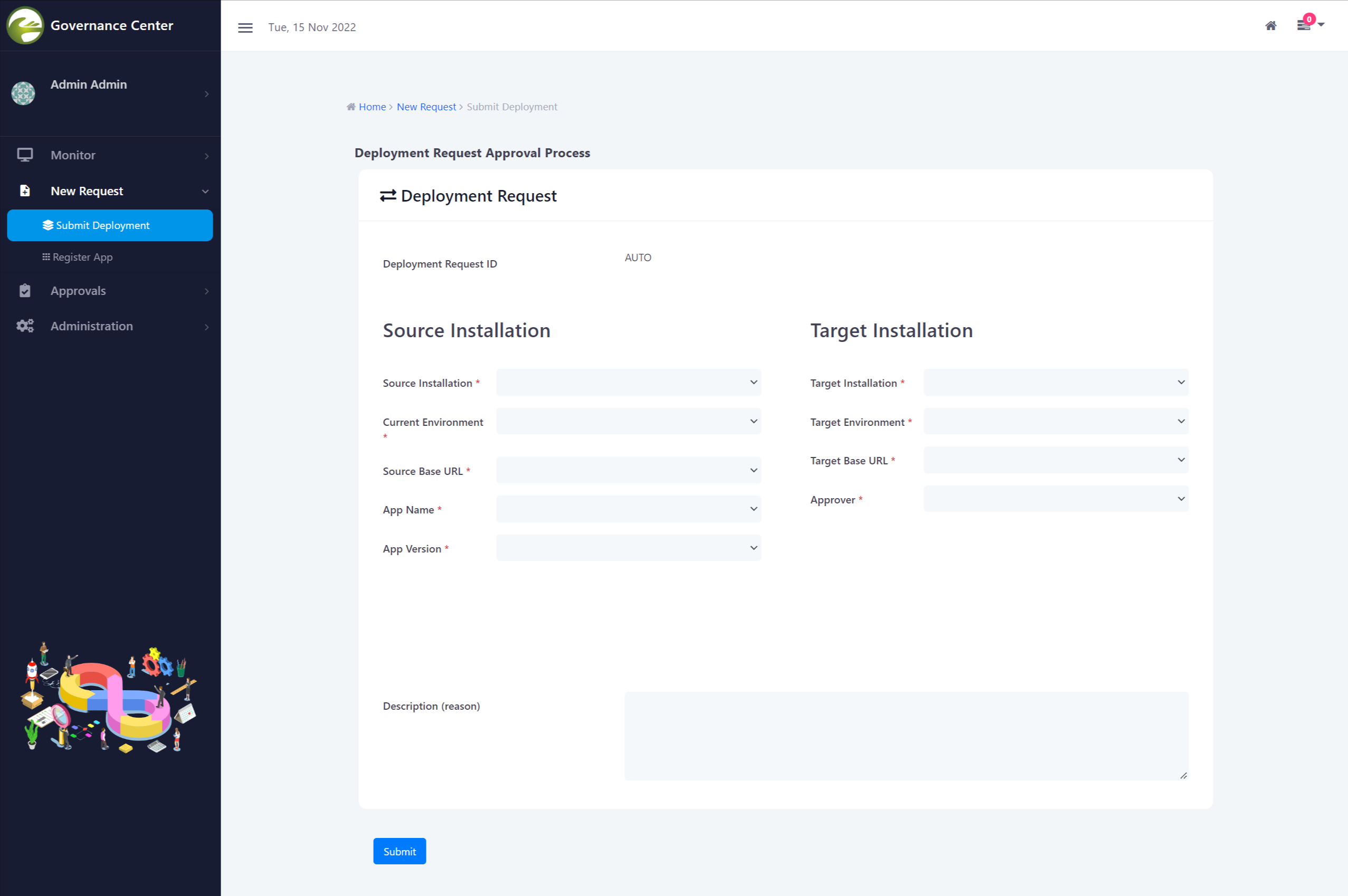Name Description Deployment Request ID Auto generated field Source Installation Select Installation from the list of Installations. Options to be mentioned from where it is coming from and put a link if its from another menu Current Environment Select Environment from the list of Environments. Options to be mentioned from where it is coming from and put a link if its from another menu Source Base URL Target URL Options to be mentioned from where it is coming from and put a link if its from another menu App Name Application Name Options to be mentioned from where it is coming from and put a link if its from another menu App Version Application Version Options to be mentioned from where it is coming from and put a link if its from another menu Target Installation Select installation from the list of Installations Options to be mentioned from where it is coming from and put a link if its from another menu Target Environment Select Environment from the list of Environments Options to be mentioned from where it is coming from and put a link if its from another menu Target Base URL Target URL Options to be mentioned from where it is coming from and put a link if its from another menu Approver Approver Name Options to be mentioned from where it is coming from and put a link if its from another menu Description (reason) Description or the reason.