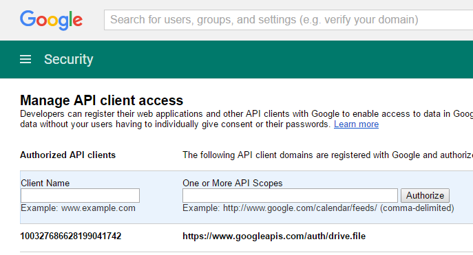 - Go to https://admin.google.com/AdminHome?chromeless=1#OGX:ManageOauthClients.