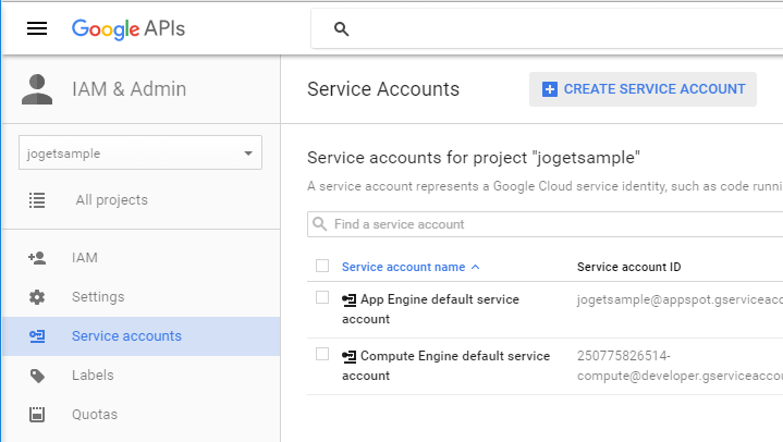 - Go to https://console.developers.google.com/projectselector/permissions/serviceaccounts