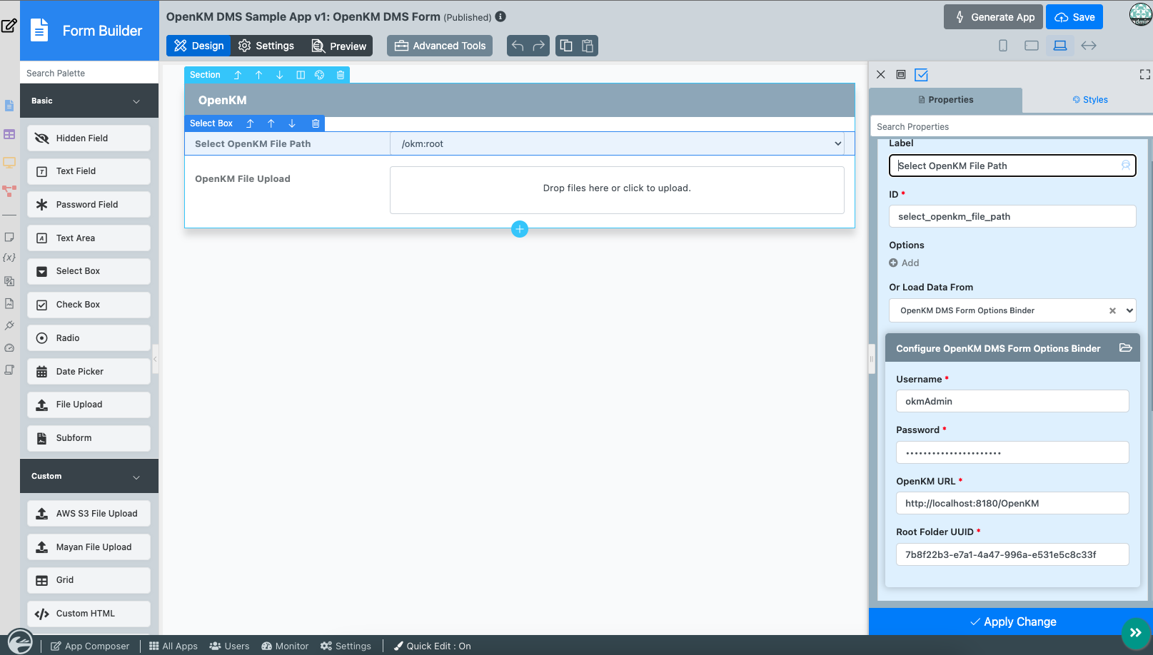 First, drag a select box and use the OpenKM DMS Form Options Binder to load the folder paths from OpenKM. Fill in the required credentials for the plugin to work as intended (Figure 3). The Root Folder UUID can be retrieved on the OpenKM folder that we intend to configure as root folder (Figure 4).