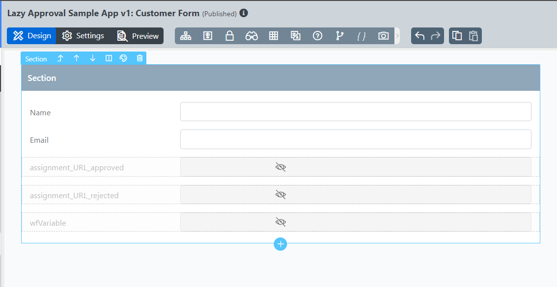The first part of the app is the form. This form gathers the user's name and email address. Inside the form, we also have hidden fields that keep track of the approval status. We'll get into how these hidden fields work when we talk about the processes. After that, we'll shoot out an email asking the user to either say yes or no to the assignment.