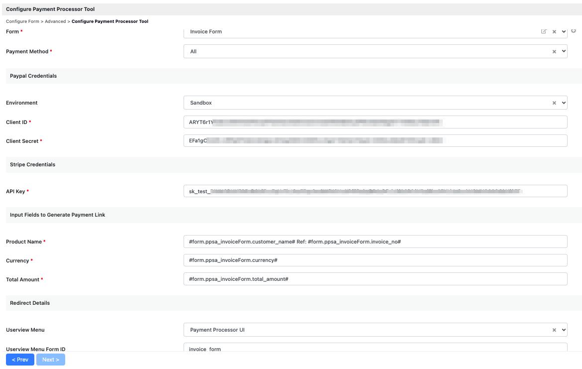 3. Fill in the plugin configurations. Refer to Payment Processor Tool Properties for more information on how to fill the plugin configurations. Redirect Details will be the form created in next step.