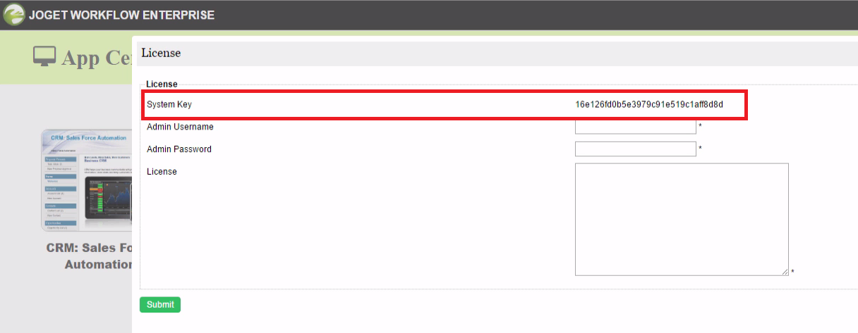 The system key is a unique key that is different for every Joget Workflow installation. - What you will need is the alphanumeric string, something like this "16e126fd0b6336c13376c2528090674". Copy the system key into your clipboard. Ensure that you only copied the string of alphanumeric text, no pre or trailing "spaces". See the screenshot above.