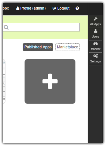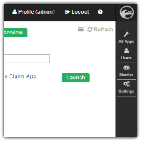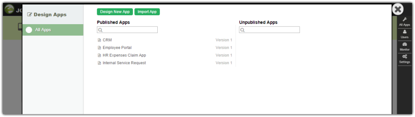 - At any time, clicking on the Joget logo on the top right will bring you back to the App Center, while clicking on any of the other buttons will open an overlay over the current window.