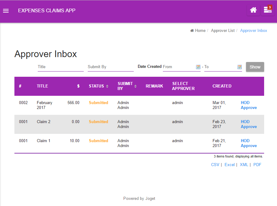 - Datalists (or Lists for short*)* are tables or reports in tabular format, providing features such as paging, sorting, filtering and exporting. Logout and login as Cat's manager Clark, then click on Approver Inbox in the menu. The page displays a datalist showing the task inbox, in this case Clark will see a pending claim from Cat.