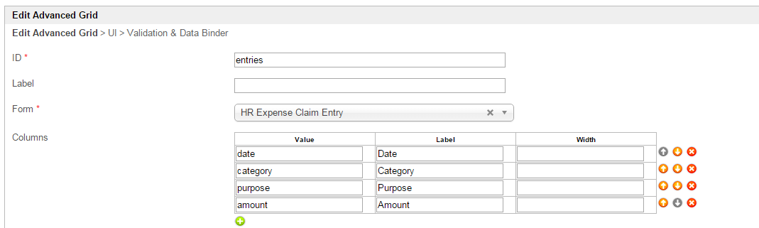 Columns | The columns defined here must be correspondent to the Form chosen above.