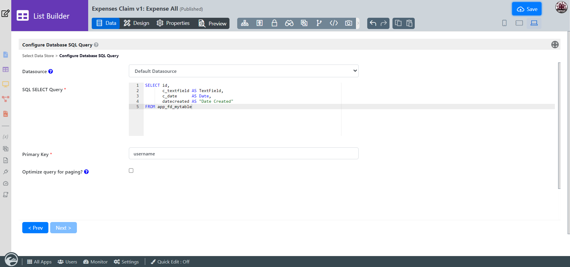 Optimize query for paging | When checked, the data store only fetches selected page's items rather than the returning the whole data set to optimize the performance for large dataset paging. Only works for MySQL and Microsoft SQL Server 2012 onwards. |