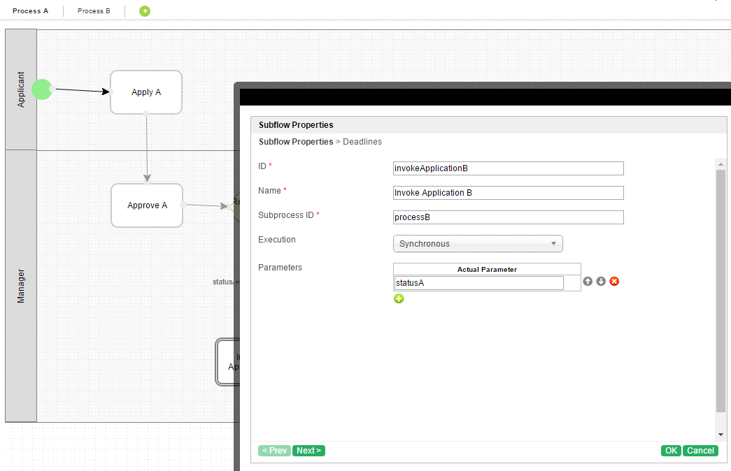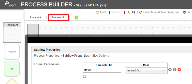 来自流程A(statusA)(见图2)的工作流程变量将被传递到流程B(statusB)(参见图3),并且在子流程(流程B)完成时也将被返回,因为它已被设置为“In和Out“。