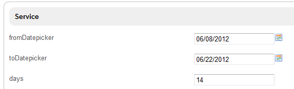 $('input[name="fromDatepicker"], input[name="toDatepicker"]').change( function(){ d1 = $('input[name="fromDatepicker"]').datepicker('getDate'); d2 = $('input[name="toDatepicker"]').datepicker('getDate'); diff = 0; if (d1 && d2) { diff = Math.floor((d2.getTime() - d1.getTime()) / 86400000); // ms per day } $('input[name=days]').val(diff); });