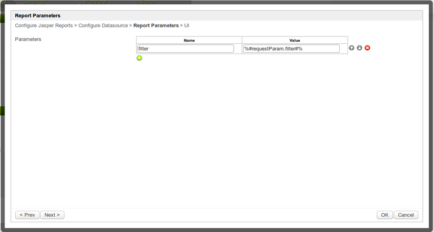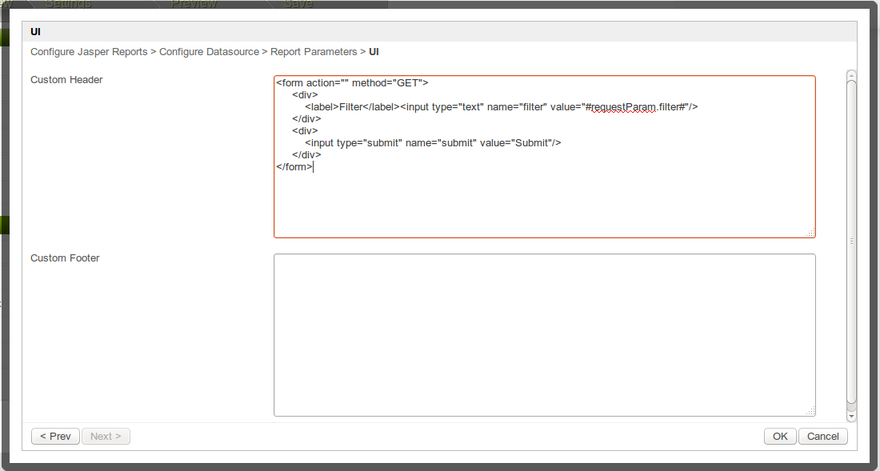 首先,在您的UserView Builder中添加一个Jasper Report菜单,并配置JRXML,如本链接所示 。然后,在“UI> Custom Header”选项中创建一个HTML表单,如下面的屏幕截图所示。使用 Request Parameters Hash Variable 来重新填充提交的值。