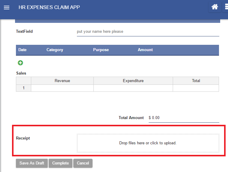 图1:突出显示从样本费用声明应用程序获取的文件上传的屏幕截图