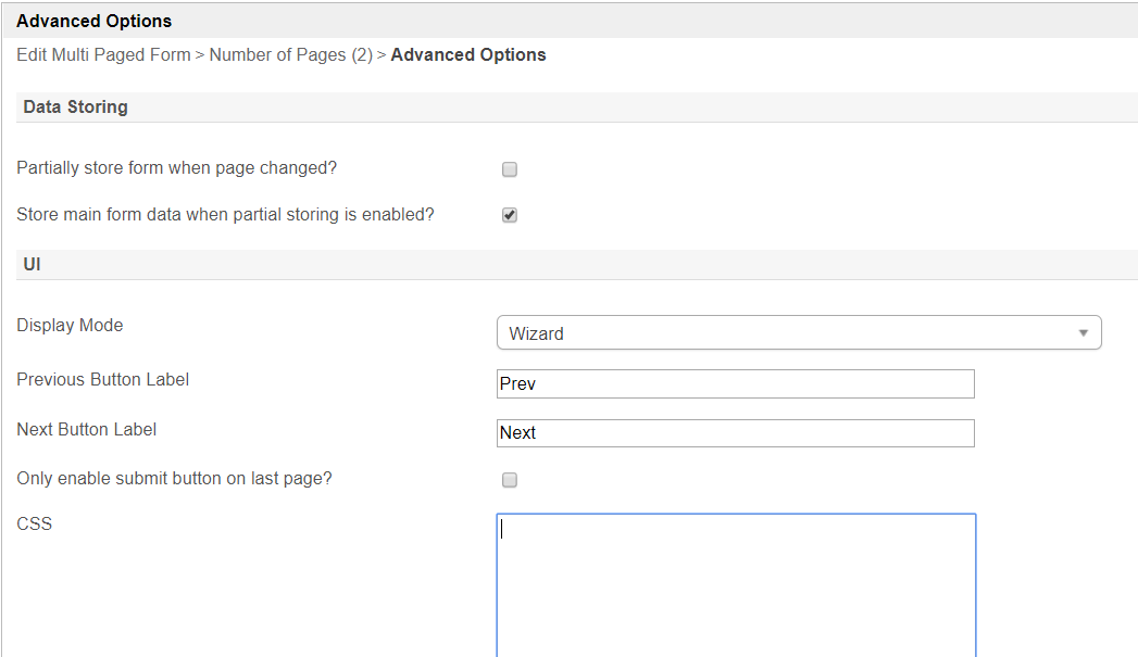 Display Mode | 确定多页面表单是否将显示在向导或选项卡中。 |