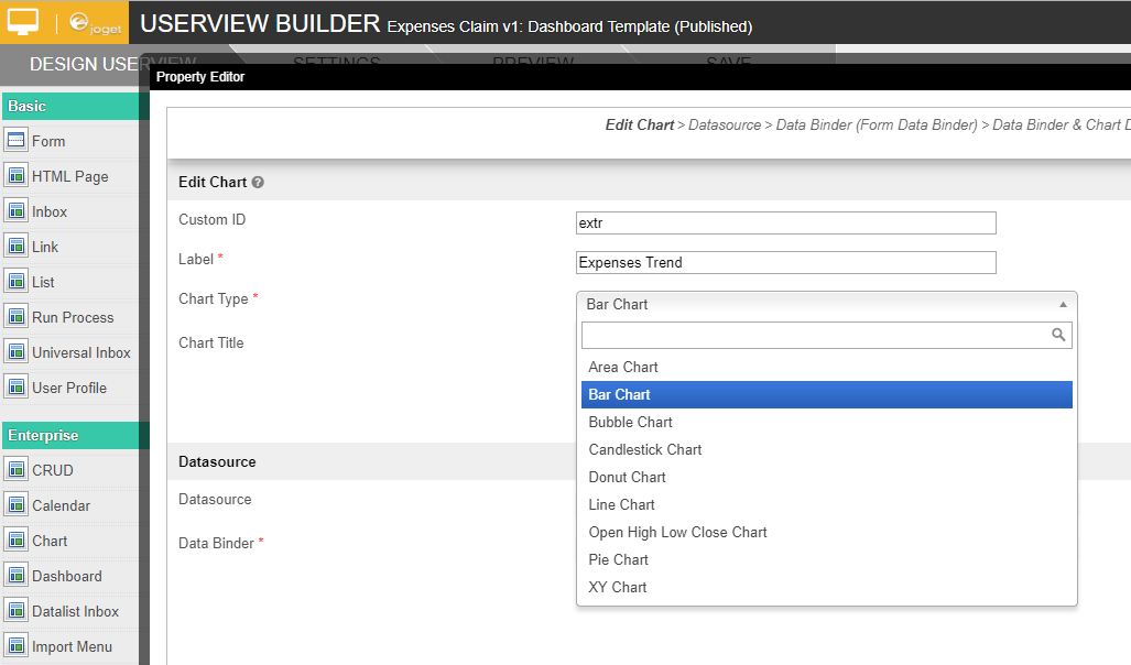 New Feature New feature in Joget Workflow for more flexible ways to build chart dataset using the existing Datalist Binders. |